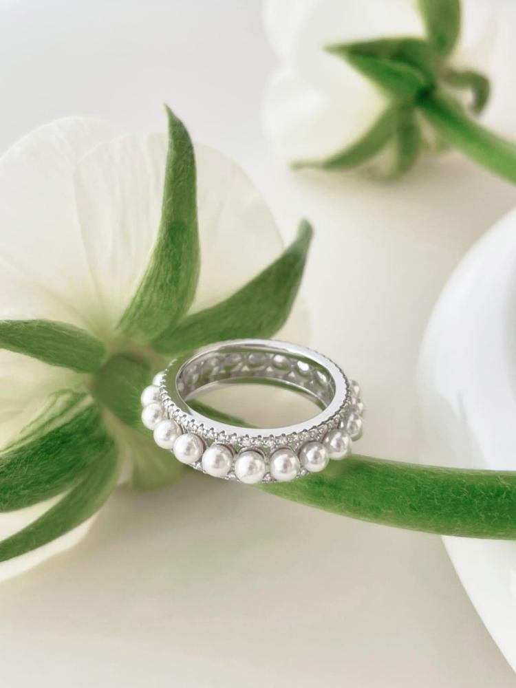 خاتم رقيق من الفضة الخالصة ومطعم بكريستالات من حجر الكوبيك زيركون .يتوسط الخاتم حزام من حبّات اللولو الزراعي .