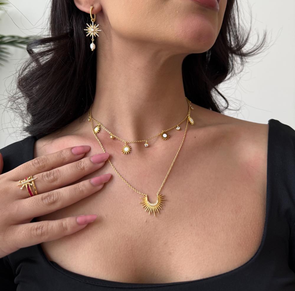 مع كل فجر، تشرق الشمس من بين الظلام، لتذكرنا بأن النور والحياة سيستمران دائمًا. تتلألأ خمسة شموس مطلية بالذهب عيار 18 قيراطا بين حبات من الكوبك زركون بلمعة الألماس على سلسلة رقيقة لعقد الإلهام لبداية جديدة.