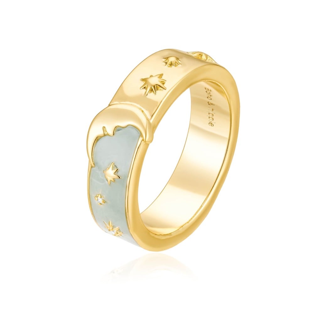 هذا الخاتم الرائع يتميز بتصميم قمري أنيق مع حجر أزرق براق مطلي بالذهب. يرمز القمر والنجوم في الخاتم إلى تمكين المرأة وثقتها بنفسها. يعتبر هذا الخاتم هدية مثالية للاحتفال بالمرأة الملهمة في حياتك، حيث يمكنك أن تعبر عن حبك وتقديرك لها بعبارة "love you to the moon and back". سيضيف هذا الخاتم البسيط والراقي لمسة من الأناقة والفخامة إلى مظهرها اليومي.